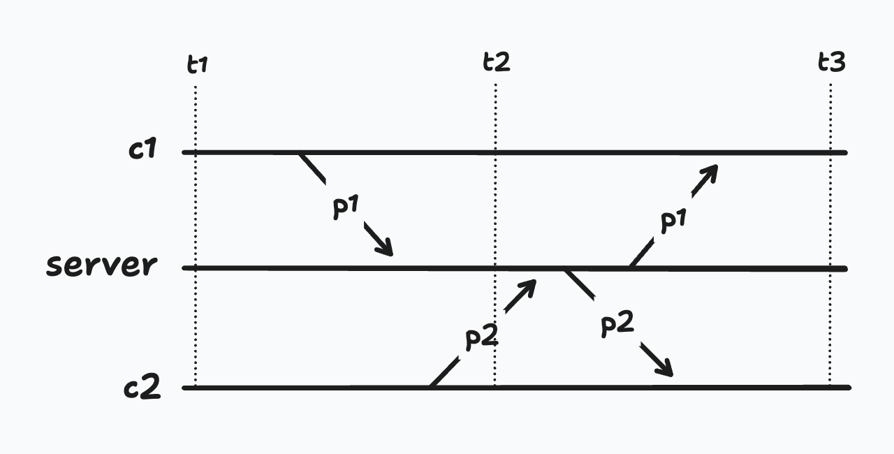 While the push is being processed, some other client c2 sends a pull p2. The server receives the pull at time t2 and processes it, returning all changes necessary to bring c2 up to t2.
